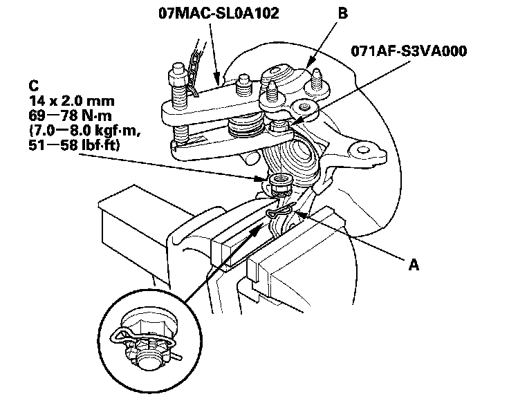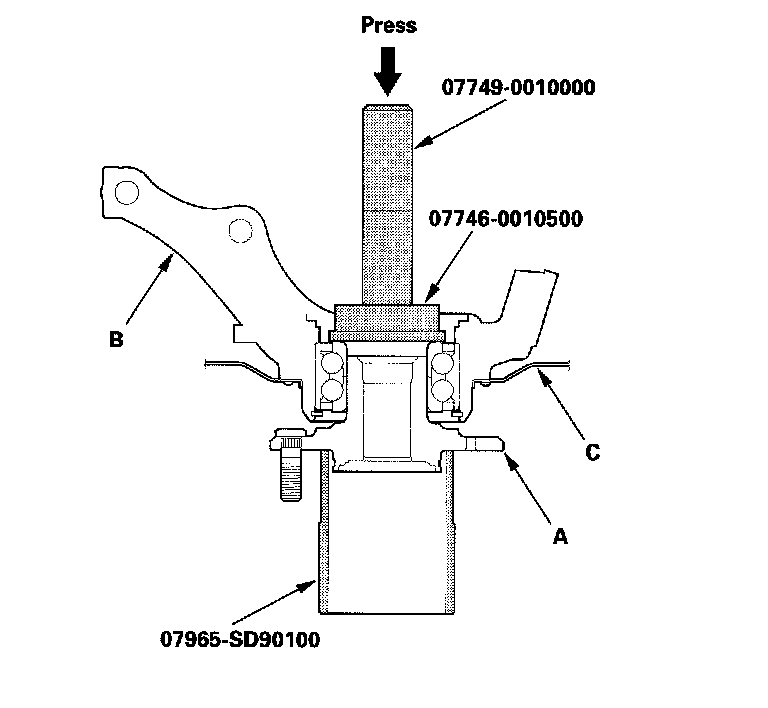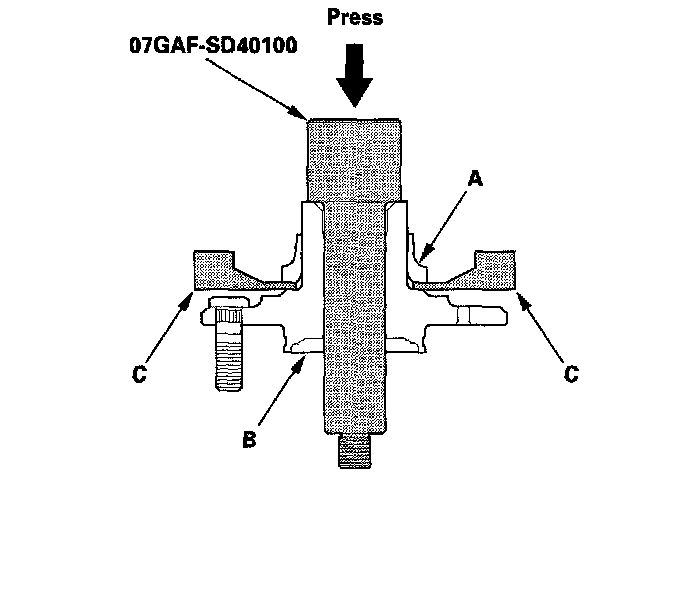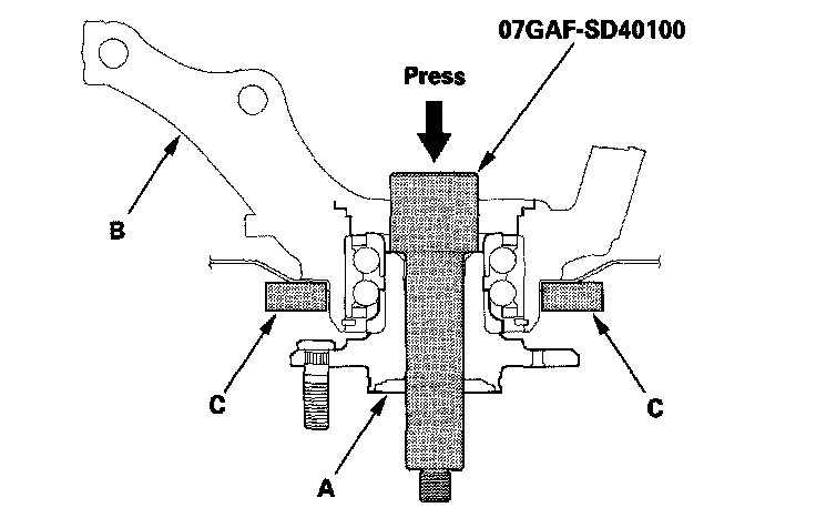 1. Separate the hub (A) from the knuckle (B) using the special tool and a hydraulic press. Hold the knuckle with the attachment (C) of the hydraulic press or equivalent tool. Be careful not to deform the splash guard. Hold onto the hub to keep it from failing when pressed clear.
