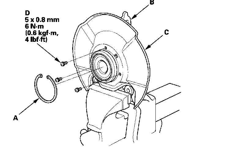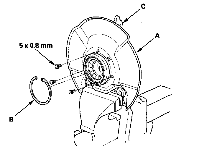 3. Remove the splash guard (A) and the snap ring (B) from the knuckle (C).