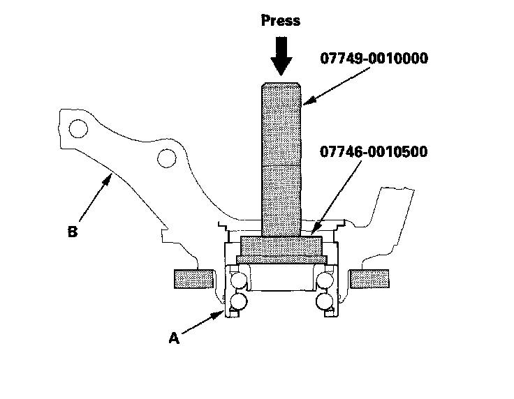 4. Press the wheel bearing (A) out of the knuckle (B) using the special tools and a press.