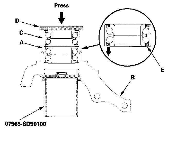 6. Press a new wheel bearing (A) into the knuckle (B) using the old bearing (C), a steel plate (D), the special tool, and a press.