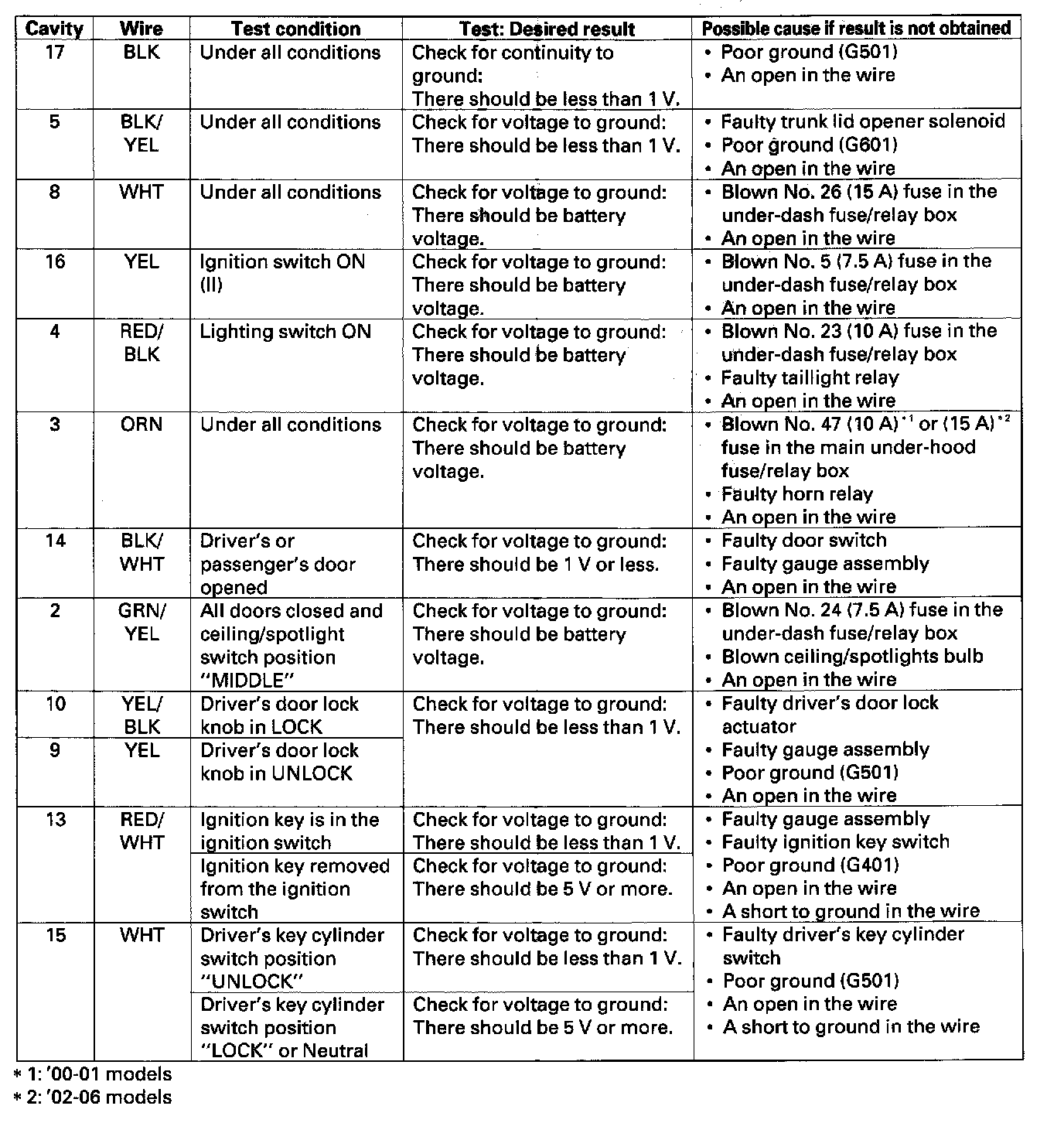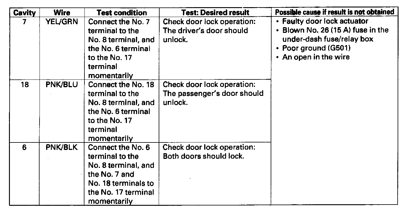 3. Reconnect the connector to the control unit, and perform the given input tests at the keyless door lock control unit connector.