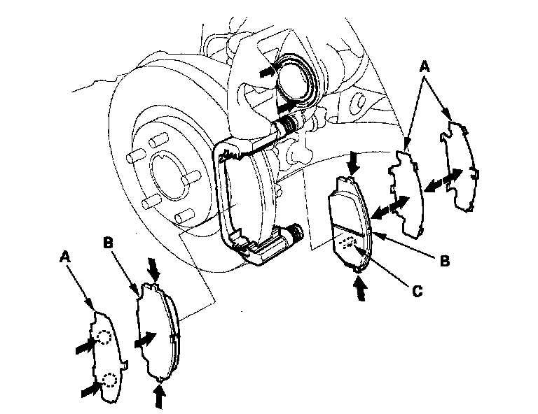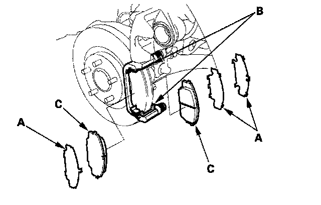 11. install the brake pads and pad shims correctly. Install the brake pads with the wear indicator (C) on the lower inside. If you are reusing the brake pads, always reinstall the brake pads in their original positions to prevent a momentary loss of braking efficiency.