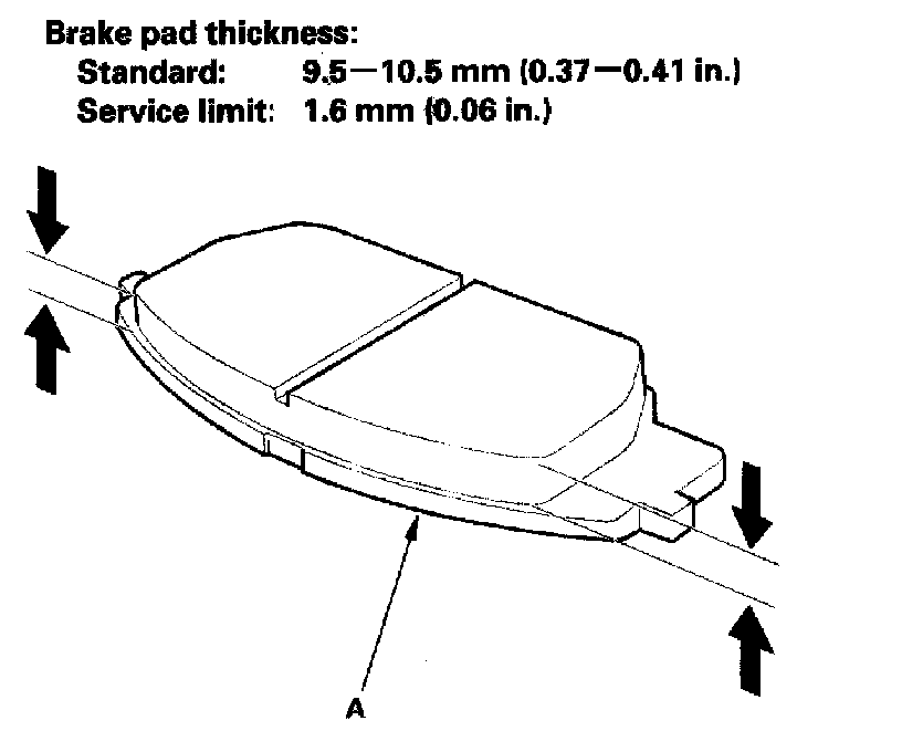 5. Using vernier calipers, measure the thickness of each brake pad lining. The measurement does not include the brake pad backing plate (A) thickness.