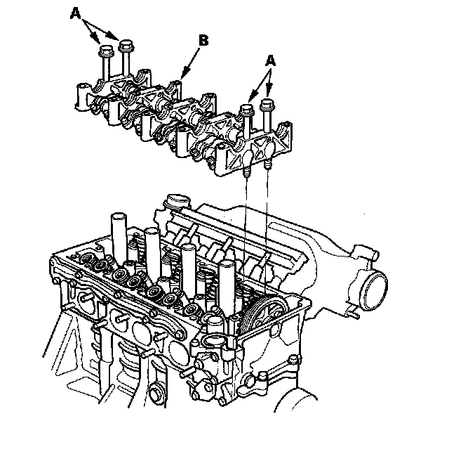 4. Insert the bolts (A) into the rocker shaft holder, then remove the rocker arm assembly (B).