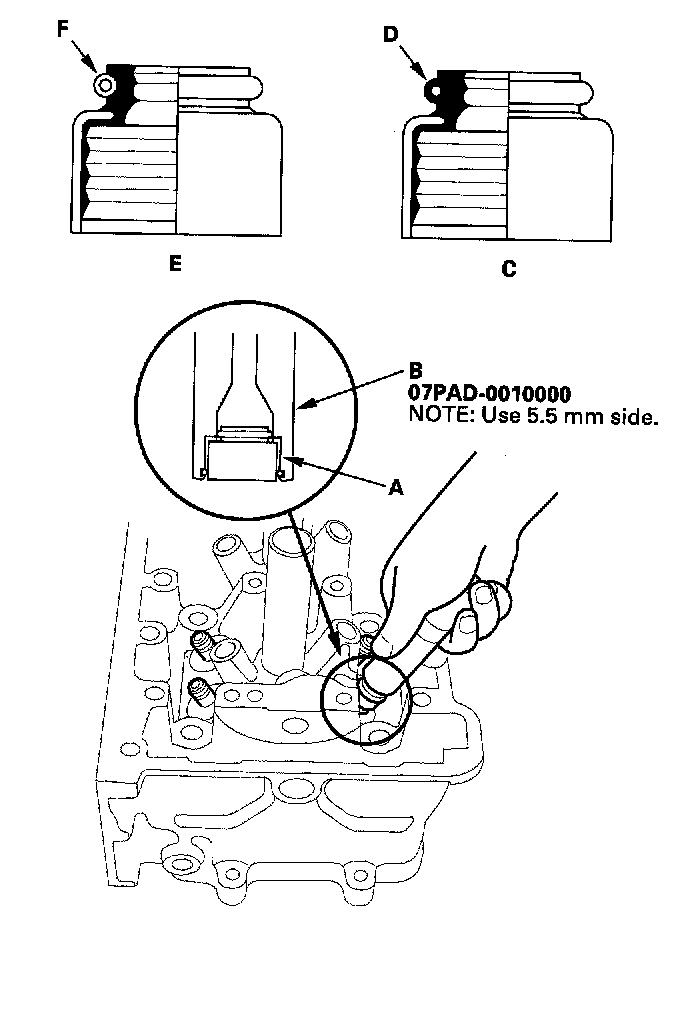 NOTE: The exhaust valve seal (C) has a black spring (D), and the intake valve seal (E) has a white spring (F). They are not interchangeable.