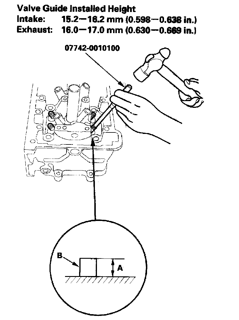 9. Apply a thin coat of new engine oil to the outside of the new valve guide. Install the guide from the camshaft side of the heat use the special tool to drive the guide to the specified installed height (A) of the guide (B). If you have all 16 guides to do, you may have to reheat the head.