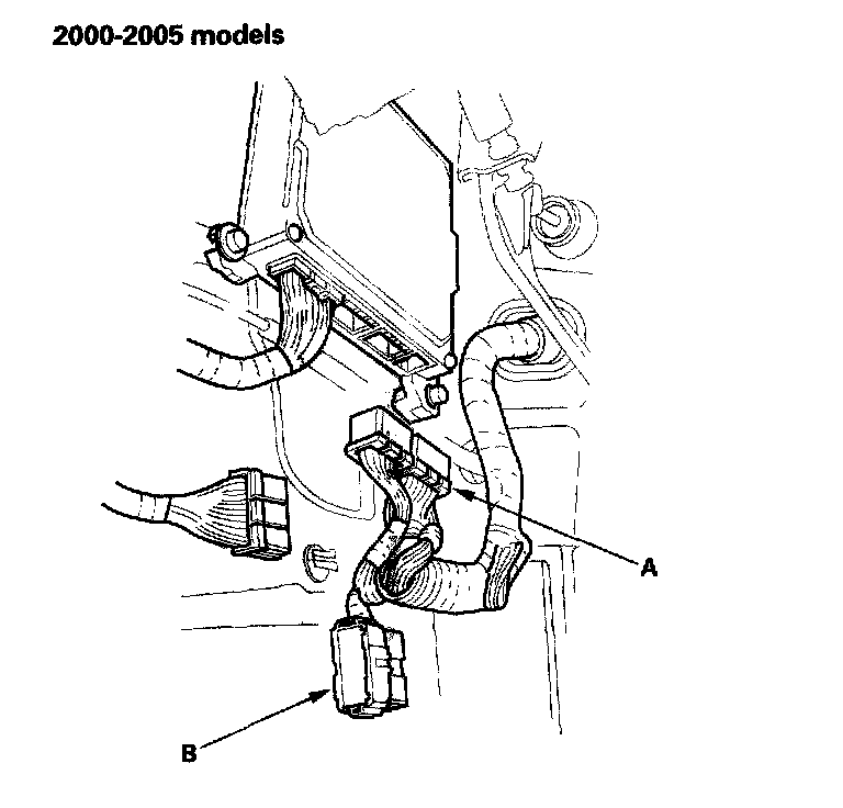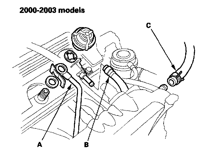 25. 2000-2005 models: Remove the fuel feed hose (A), fuel return hose (B) and brake booster vacuum hose (C).
