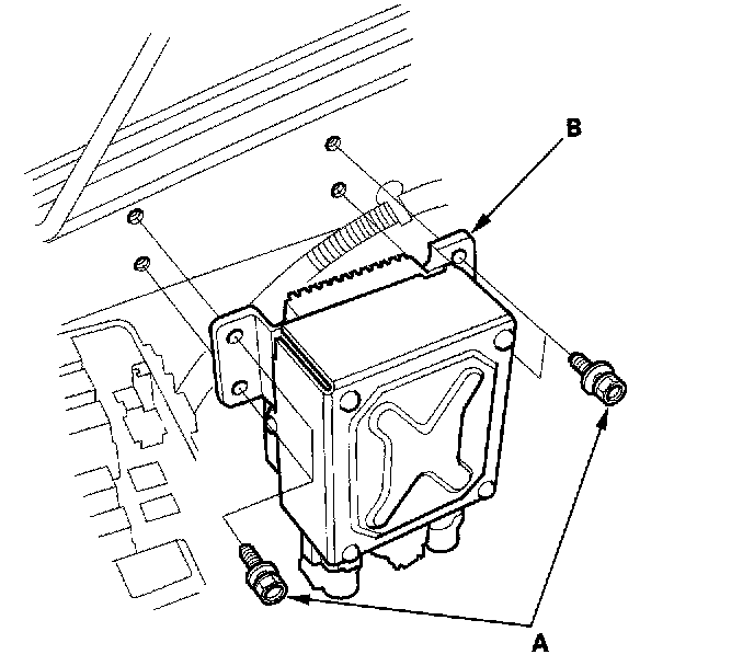14. Remove the four bolts (A) securing the electrical power steering (EPS) control unit (B).
