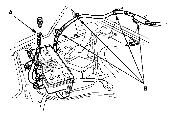15. Remove the battery cable (A) from the main under-hood fuse/relay box, then remove the harness clamps (B).