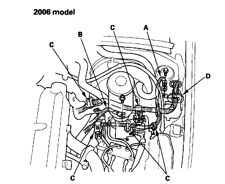 27. 2006 model: Remove the quick-connect fitting cover (A), then disconnect the fuel feed hose (B) and brake booster vacuum hose (C).