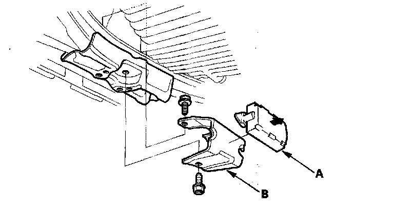21. Remove the engine stop bracket cushion (A), then remove the engine stop bracket (B).