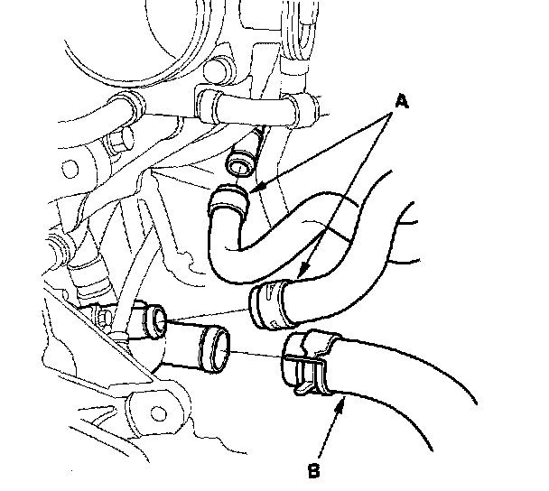 23. Remove the heater hoses (A) and lower radiator hose (B).