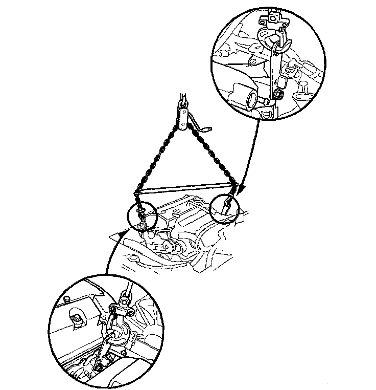 29. Attach the chain hoist to the engine as shown. Take care not to damage the rocker arm oil control solenoid (VTEC solenoid valve) and wire harness.