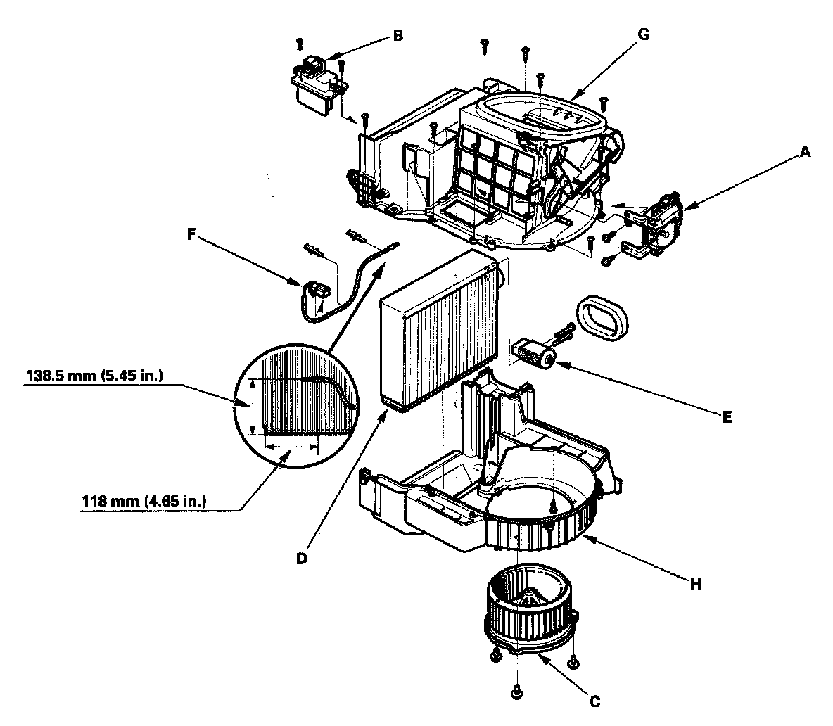 - The recirculation control motor (A), the power transistor (B), and the blower motor (C) can be replaced without removing the blower/evaporator unit.