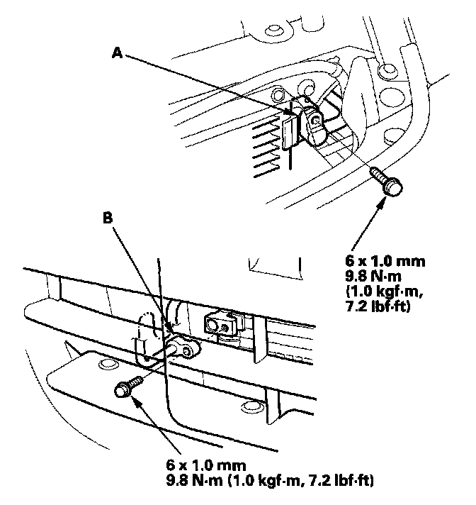 4. Remove the bolts, then disconnect the discharge line (A) and the A/C condenser line (B) from the A/C condenser. Plug or cap the lines immediately after disconnecting them to avoid moisture and dust contamination.
