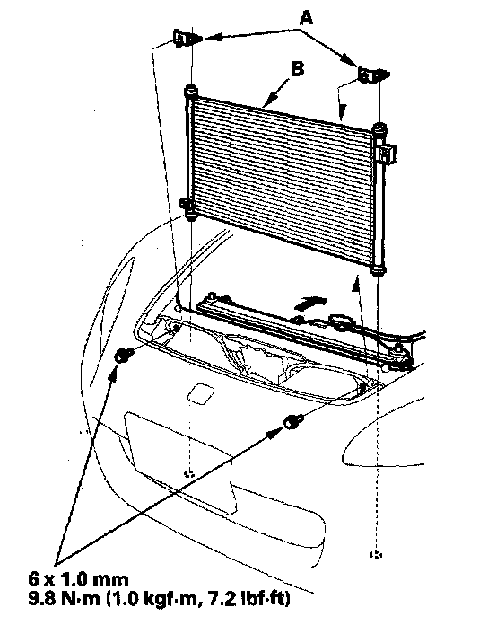 6. Install the A/C condenser in the reverse order of removal, and note these items: