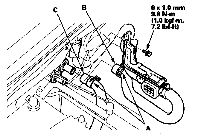 6. Remove the mounting bolt from the heater valve. Slide the hose clamps (A) back, then disconnect the inlet heater hose (B) and the outlet heater hose (C) from the heater unit. Engine coolant will run out when the hoses are disconnected; drain it into a clean drip pan. Be sure not to let coolant spill on the electrical parts or the painted surfaces. If any coolant spills, rinse it off immediately.