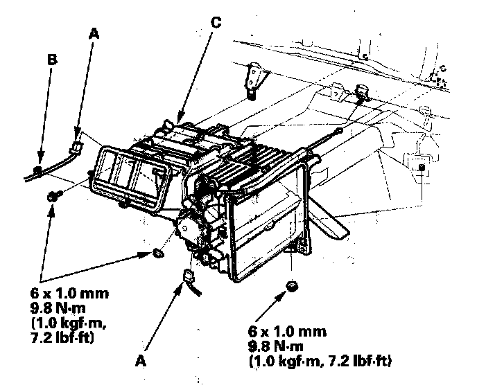 13. Disconnect the connectors (A) from the mode control motor and the air mix control motor, then remove the wire harness clip (B). Remove the mounting nuts, the mounting bolt, and the heater unit (C).