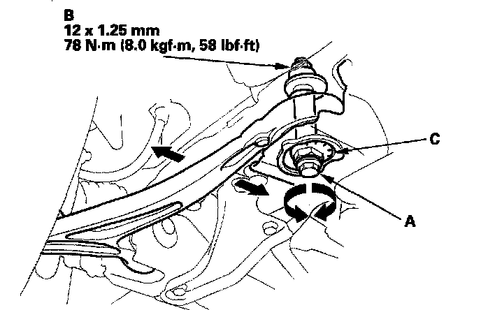 NOTE: Adjust the rear toe by adjusting the control arm and the lower arm by the same amount in opposite directions to each other (for example, when you move the control arm out, move the lower arm in, and vice versa).