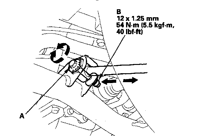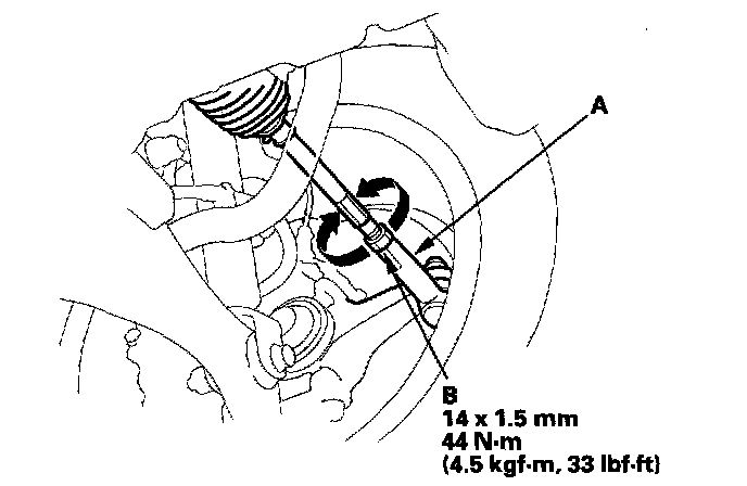 3. Hold the tie-rod end (A), and loosen the tie-rod locknut (B).