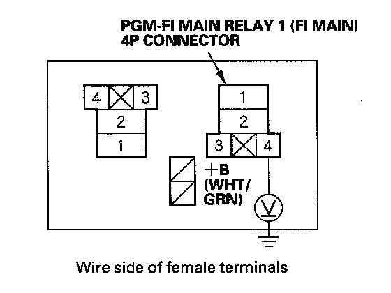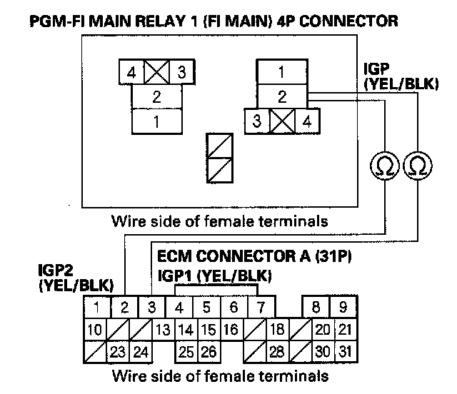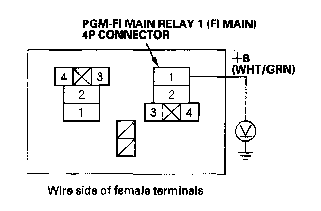 38. Check for continuity between body ground and PGM-FI main relay 1 (FI MAIN) 4P connector terminals No. 1 and No. 4 individually.