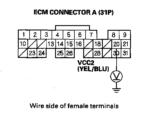 83. Disconnect the connector from each of these sensors, one at a time, and measure voltage between body ground and ECM connector terminal A20 with the ignition switch ON (II).