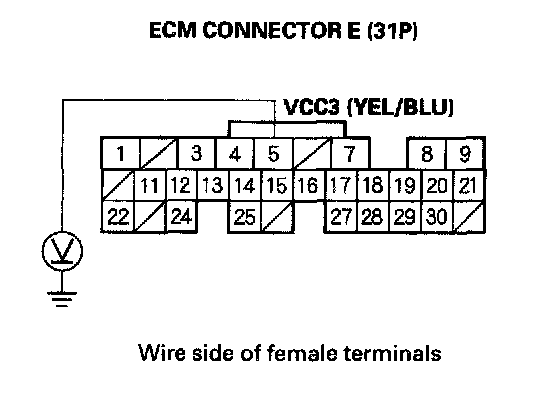 91. Disconnect the connector from each of these sensor, one at time, and measure voltage between body ground and ECM connector terminal E5 with the ignition switch ON (II).