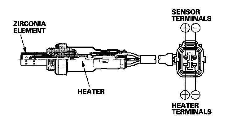 The secondary HO2S detects the oxygen content in the exhaust gas downstream of the three way catalytic converter (TWO, and sends signals to the ECM which varies the duration of fuel injection accordingly. To stabilize its output, the sensor has an internal heater. The ECM compares the HO2S output with the A/F sensor output to determine catalyst efficiency. The secondary HO2S is located on the TWC.