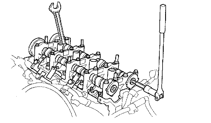 2. Hold the exhaust camshaft with an open-end wrench, then loosen the bolt.