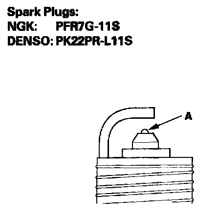 4. Replace the plug at the specified interval, or if the center electrode is rounded (A). Use only the spark plugs listed.