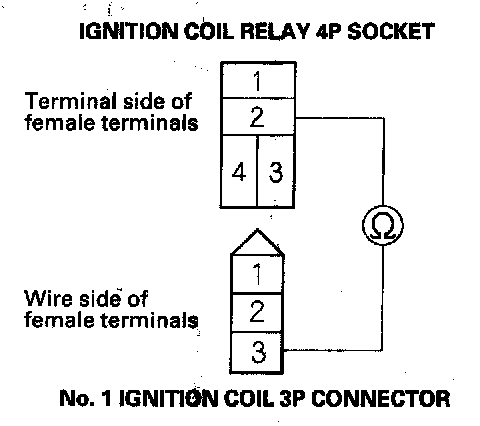 4. Check for continuity between ignition coil relay 4P socket terminal No. 2 and No. 1 ignition coil 3P connector terminal No. 3.