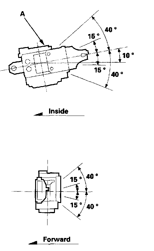 2. Make sure that the seat belt does not lock when the retractor (A) is leaned slowly up to 15 degrees from the mounted position. The seat belt should lock when the retractor is leaned over 40 degrees. Do not attempt to disassemble the retractor.