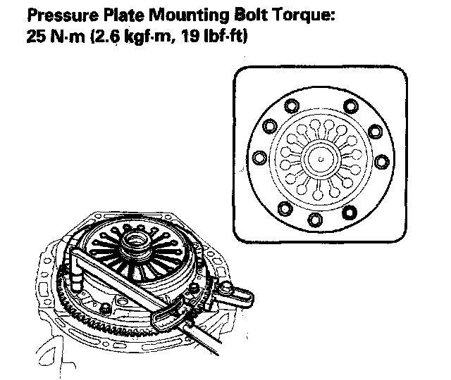 Torque the mounting bolts in a crisscross pattern, tighten the bolts in several steps to prevent warping the diaphragm spring.