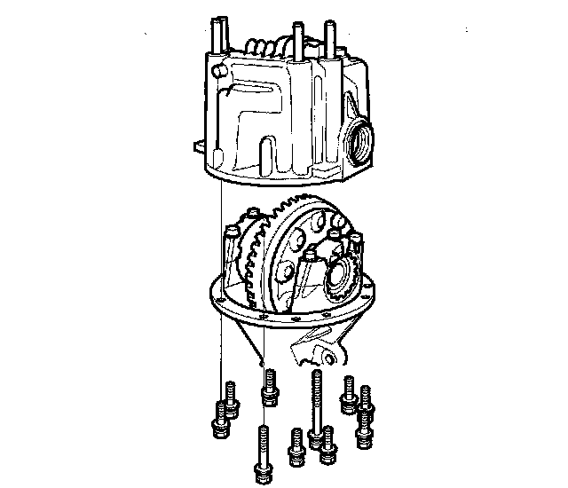 2. Remove the ten mounting bolts in a crisscross pattern in several steps, then remove the differential case assembly.