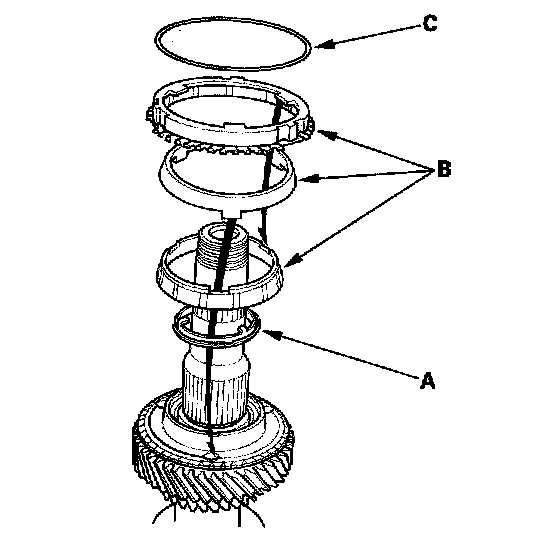 2. Install the friction damper (A), the double cone synchro (B), and the synchro spring (C) as shown.
