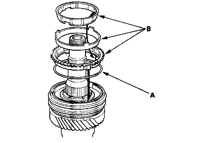 4. Install the synchro spring (A) and the double cone synchro (B) as shown.