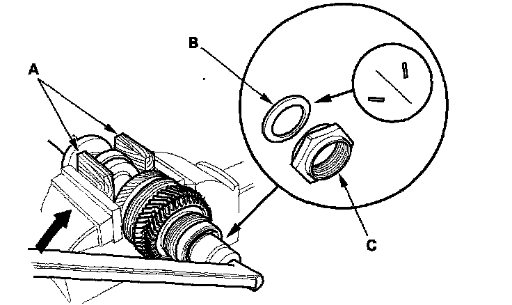 12. Install the spring washer (B) and the new 27 mm locknut (C).