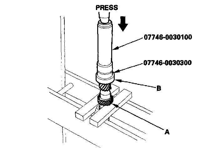1. Support 2nd gear (A) on steel blocks, then install the ball bearing (B) using the special tools and a press as shown.