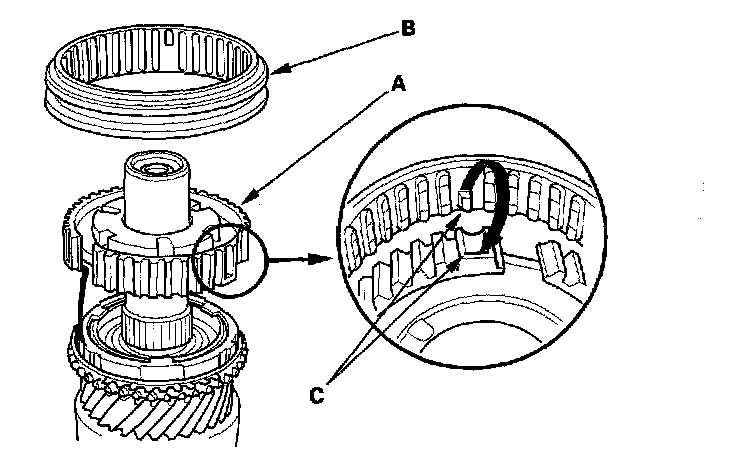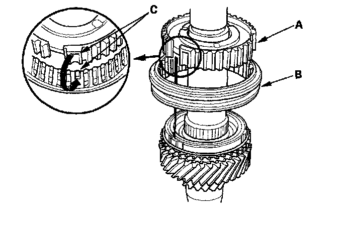 3. Install the 5th/6th synchro hub (A) and the sleeve (B) by aligning the stops (C).