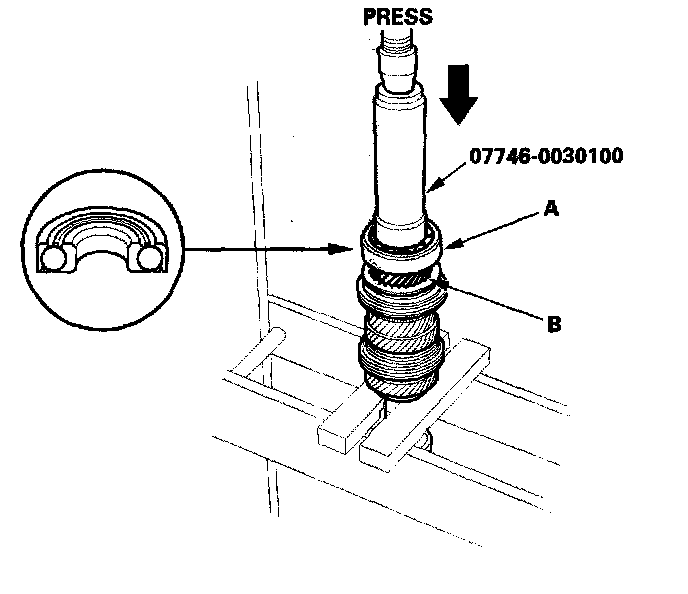 13. Install the angular ball bearing (A) with the thin edge of the outer race facing 3rd gear (B). Use the special tool and a press.