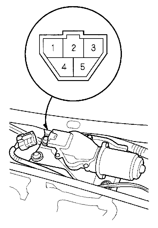 5. Connect the battery power to the No. 4 terminal, and ground to the No. 2 and No. 3 terminals of the 5P connector. Then connect an analog voltmeter between the No. 4 (+) terminal and the No. 5 (ground) terminal. When the park switch contacts, the pointer should swing. If not, replace the motor.