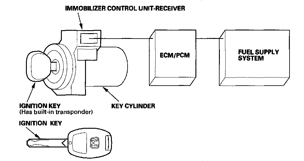 When the key is inserted in the ignition switch and turned to the ON (II) position, the immobilizer control unit-receiver sends power to the transponder in the ignition key. The transponder then sends a coded signal back to the immobilizer control unit-receiver which then sends a coded signal to the ECM/PCM. The code is a rolling type embedded in the immobilizer control unit-receiver instead the PCM.