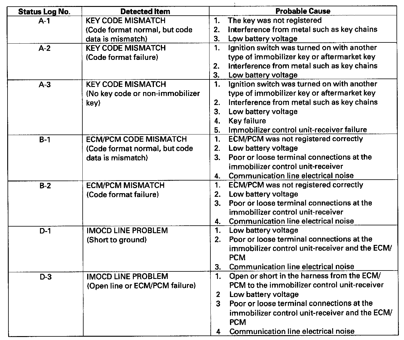 Status LogIf you suspect there is a immobilizer system problem, check the status log. The HDS can be used to check the number of times the immobilizer control unit receiver doesn't permit the engine to run by checking the LOG.STATUS.