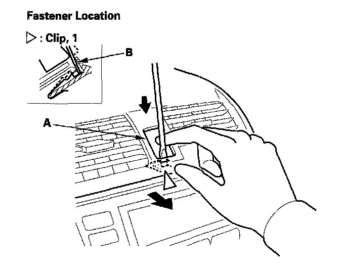 1. Push the hazard warning switch button (A). Carefully insert a flat-tip screwdriver into the slot (B) below the button, and push down on the center clip.