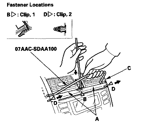 2. Set both ends of the special tool in the center vent openings (A) as shown. While pressing the center clip (B) down, pull the upper panel (C) back with the tool to detach the clips (D).