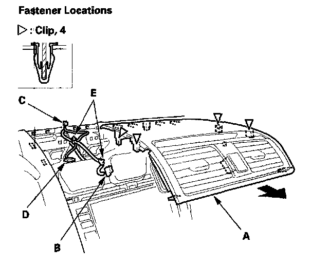 4. Pull the upper panel (A) in the direction shown to release the remaining clips, disconnect the hazard warning switch connector (B), and if equipped, sunlight sensor connector (C) and navigation subdisplay connector (D). Detach the harness clips (E), then remove the upper panel.