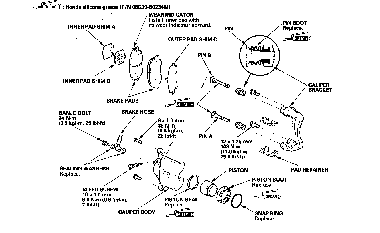 Front Brake Caliper OverhaulCAUTION: Frequent inhalation of brake pad dust, regardless of material composition, could be hazardous to your health.