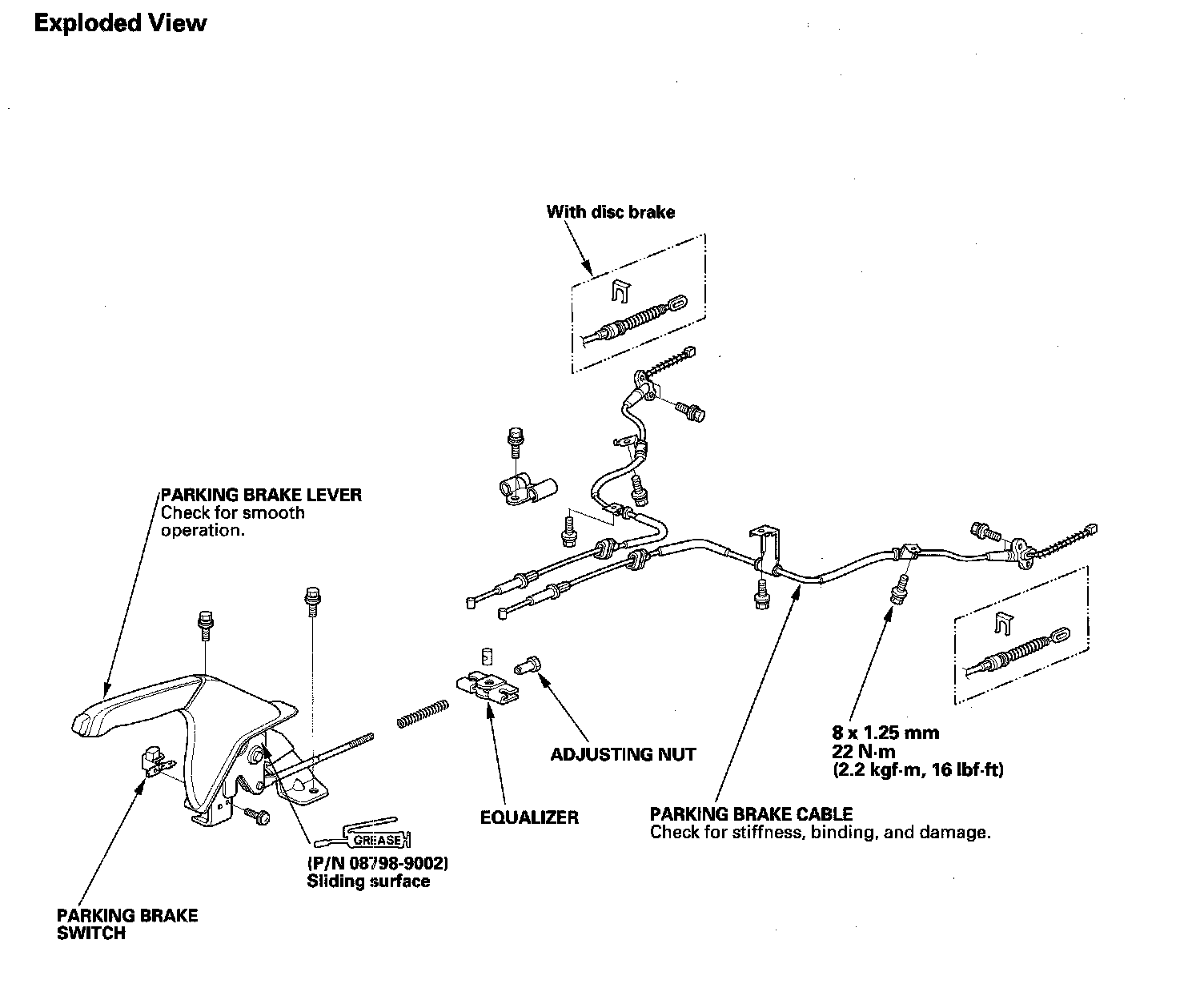 ^ Adjust the parking brake. Apply the parking brake firmly 10 times then adjust it again.