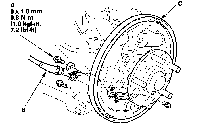 2. Remove the flange bolts (A) and parking brake cable (B) from the backing plate (C).