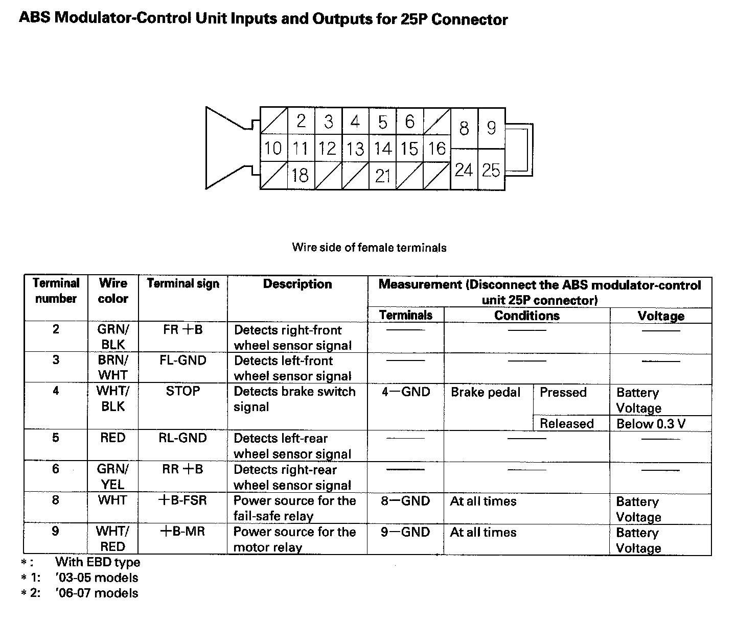 ABS Modulator-Control Unit Inputs And Outputs For 25P Connector: